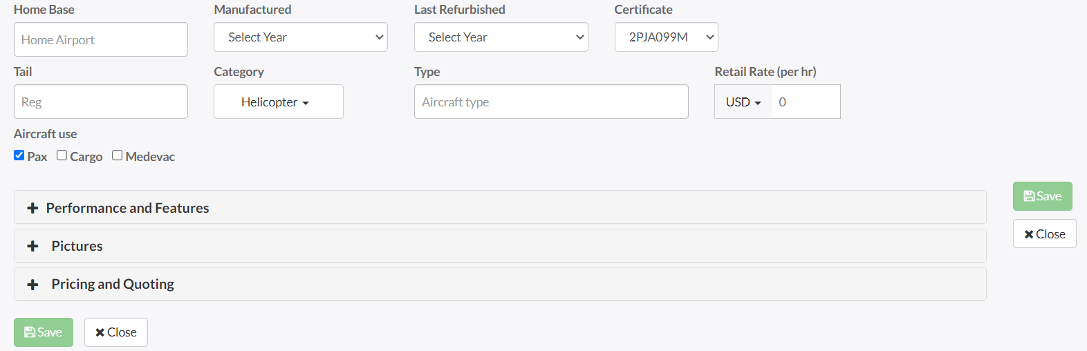- You are now able to edit all of the information for the aircraft. Be sure to expand the Performance and Features, Pictures and Pricing and Quoting sections to edit that data as well.