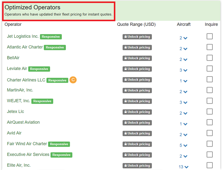 Optimized operators are prioritized and displayed first in FlyEasy when sourcing options are shown. To become optimized, operators must configure accurate pricing, features, and define all associated costs within their fleet—such as crew overnights, landing fees, parking charges, and other operational expenses. Updated aircraft photos should also be included.