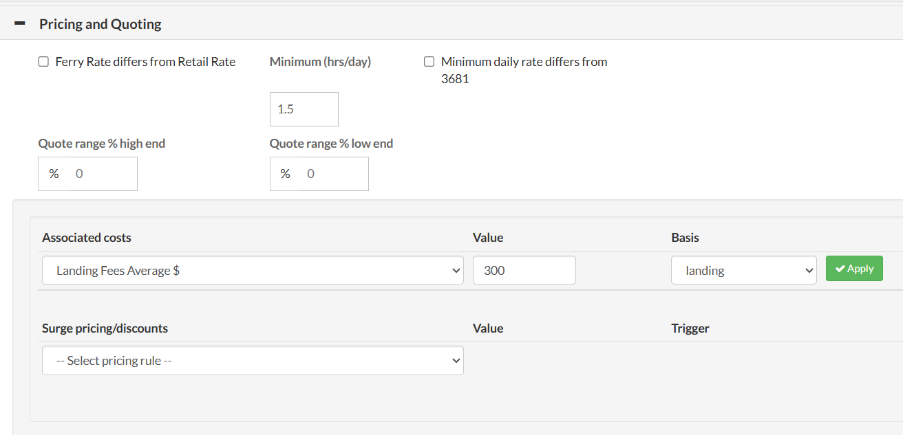 - Pricing and Quoting section, as shown below. This is where you'll enter or review base pricing and associated operational costs.
