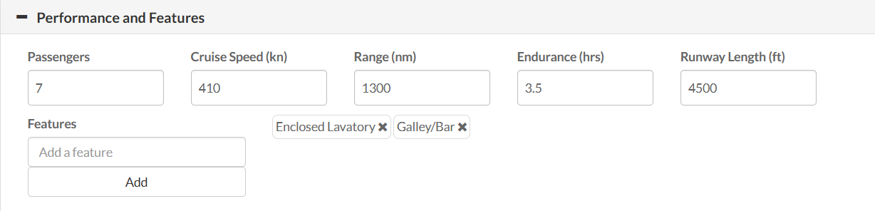 - Select each tail individually. For each one, ensure the home base and retail rate are listed. Then, scroll down to the Performance and Features section as shown below. This is where you'll enter or review aircraft details including features.