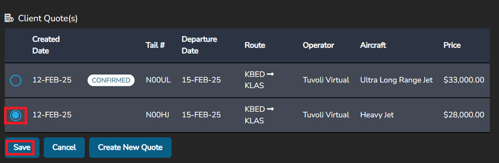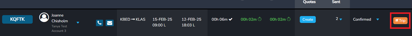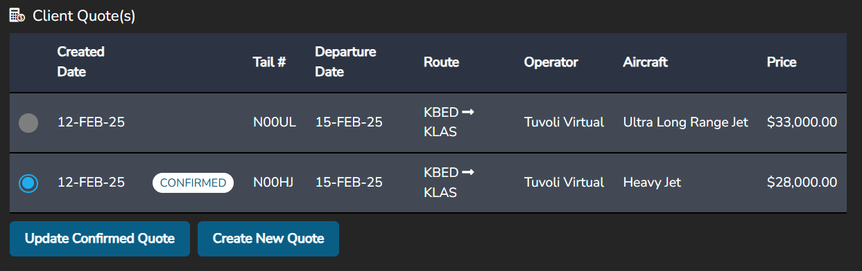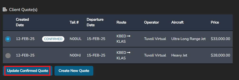 Once selected, it will direct you to the "Trip Management" page. Scroll halfway down the page to "Client Quote (s)" located on the left hand side. The two quote options are displayed with the confirmed quote clearly marked. In order to change the current "confirmed" quote to a different one, simply select "Update confirmed quote", click the radio button next to the quote you want to switch it to and save.