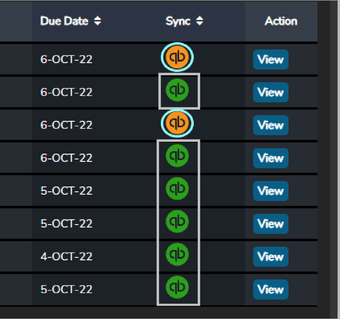 Orange are the invoices that are not synced. If you hover over the Green "QB" it will display the time and date when synched.
