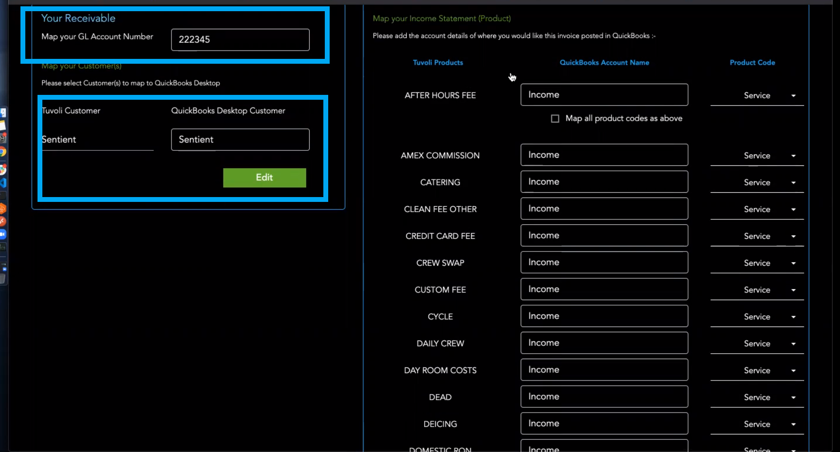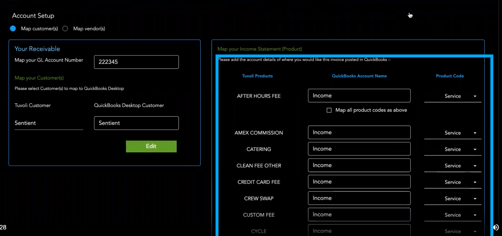 5. Enter your GL number and complete " Tuvoli Customer '' and " QuickBooks Customer '' fields.
