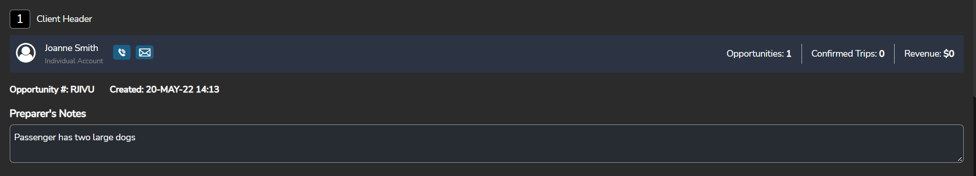 - The next page will display your contact information, Opportunity number, date of creation and Preparers notes. These are internal notes and will NOT display to the client (example- Passenger has two large dogs)