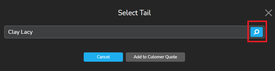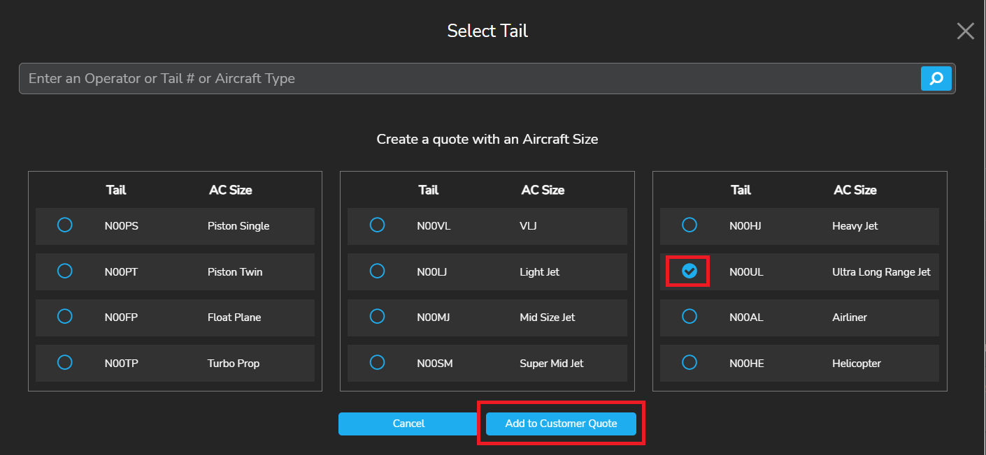 - Regardless of whether you add the tail by Operator, Tail # or Aircraft Type, once you have made the desired selection click "Add to Customer Quote"