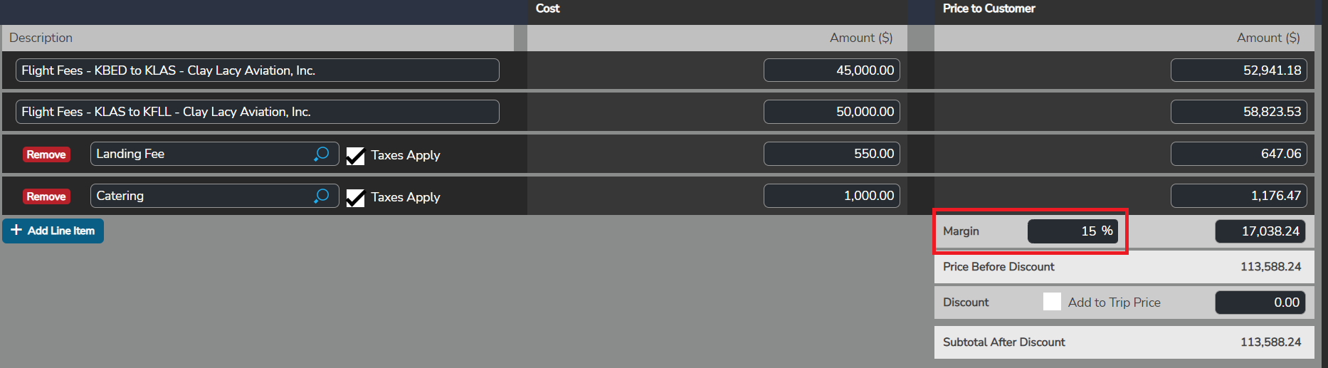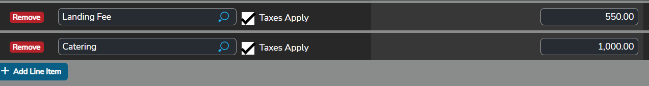 - To add fees to the quote i.e. landing or catering, simply click on "add line item". You can check or uncheck if you would like taxes to be applied to the fee. Again, the calculator will automatically update the pricing accordingly.