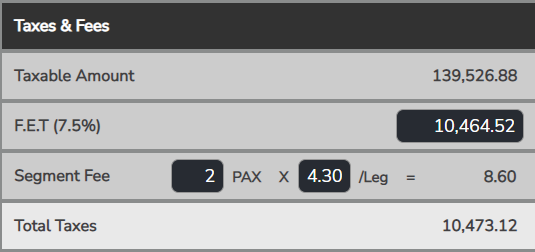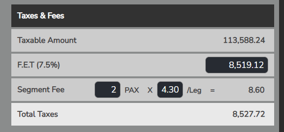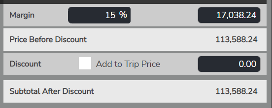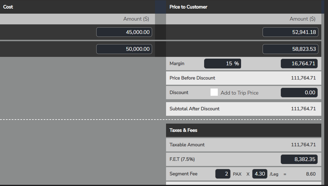 - All in pricing. You have the ability to select a flat all in pricing cost for the trip. Since I selected an all in pricing on this example, you can see margin and taxes/fees adjusted up to 30.8%