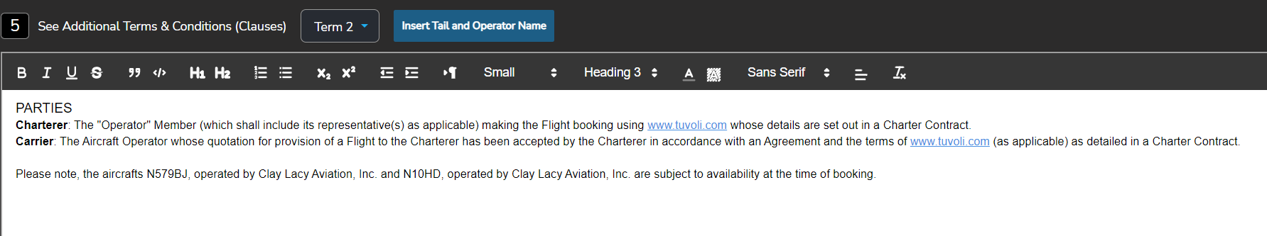 - Here is where you will add any important terms and conditions which have been previously created and added to your My Company Page, clauses, restrictions, operator information etc., into the quote. The receiver of the quote WILL receive everything in this field.