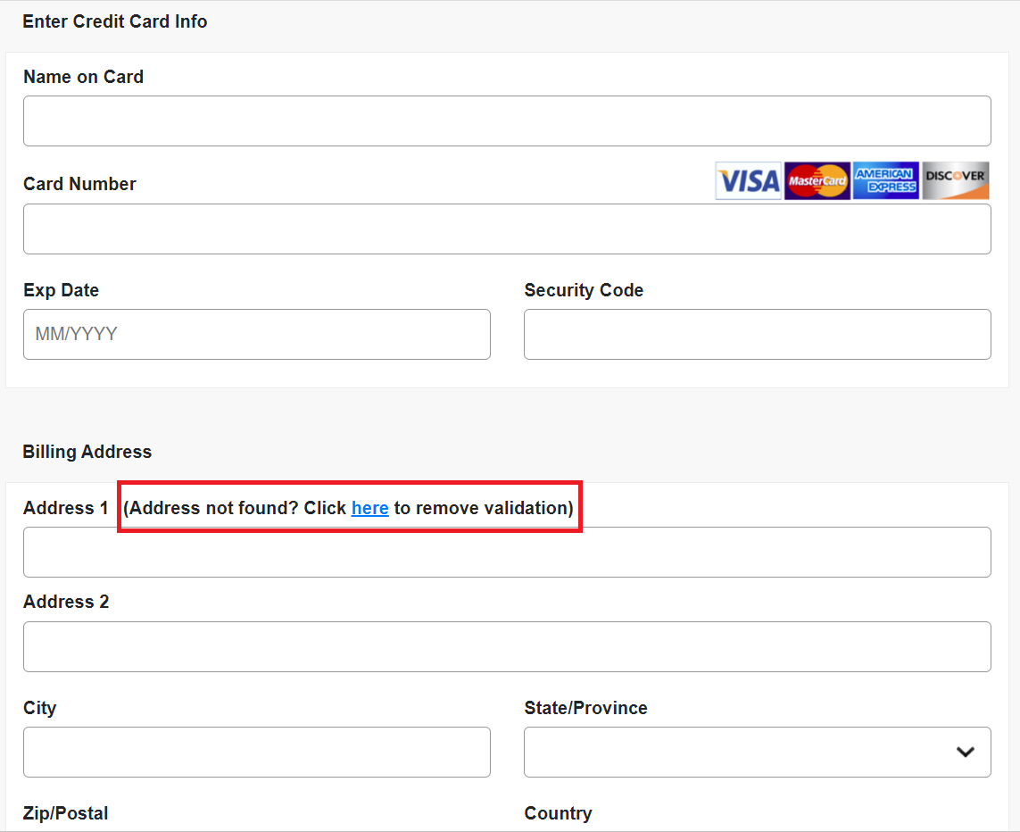- IF the customer's address is not populating using the google look up, select "click here to remove (address) validation". You will typically run into this when processing credit cards from other countries.
