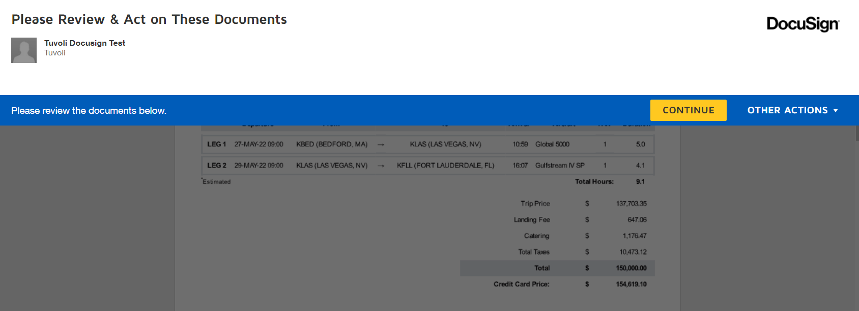 ", it will bring them to the Docusign client check out - Clicking "continue" will walk them through the check out process