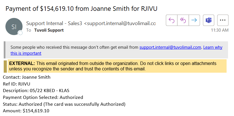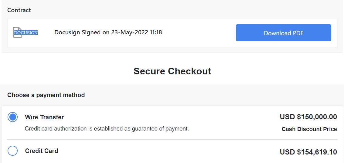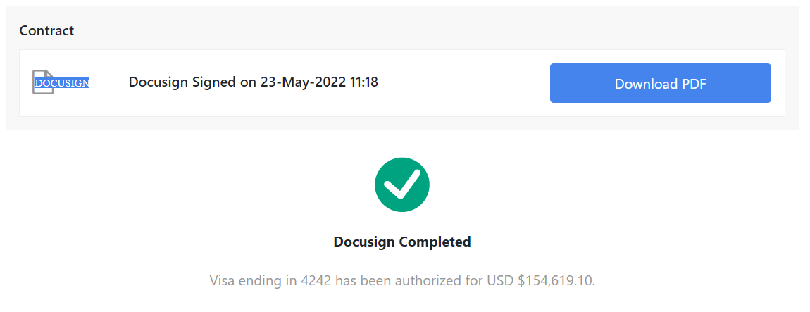 - Once the payment is processed the following screen will show where a copy of the signed client contract can be downloaded. The Client and Sales person will also receive an email advising of the payment.