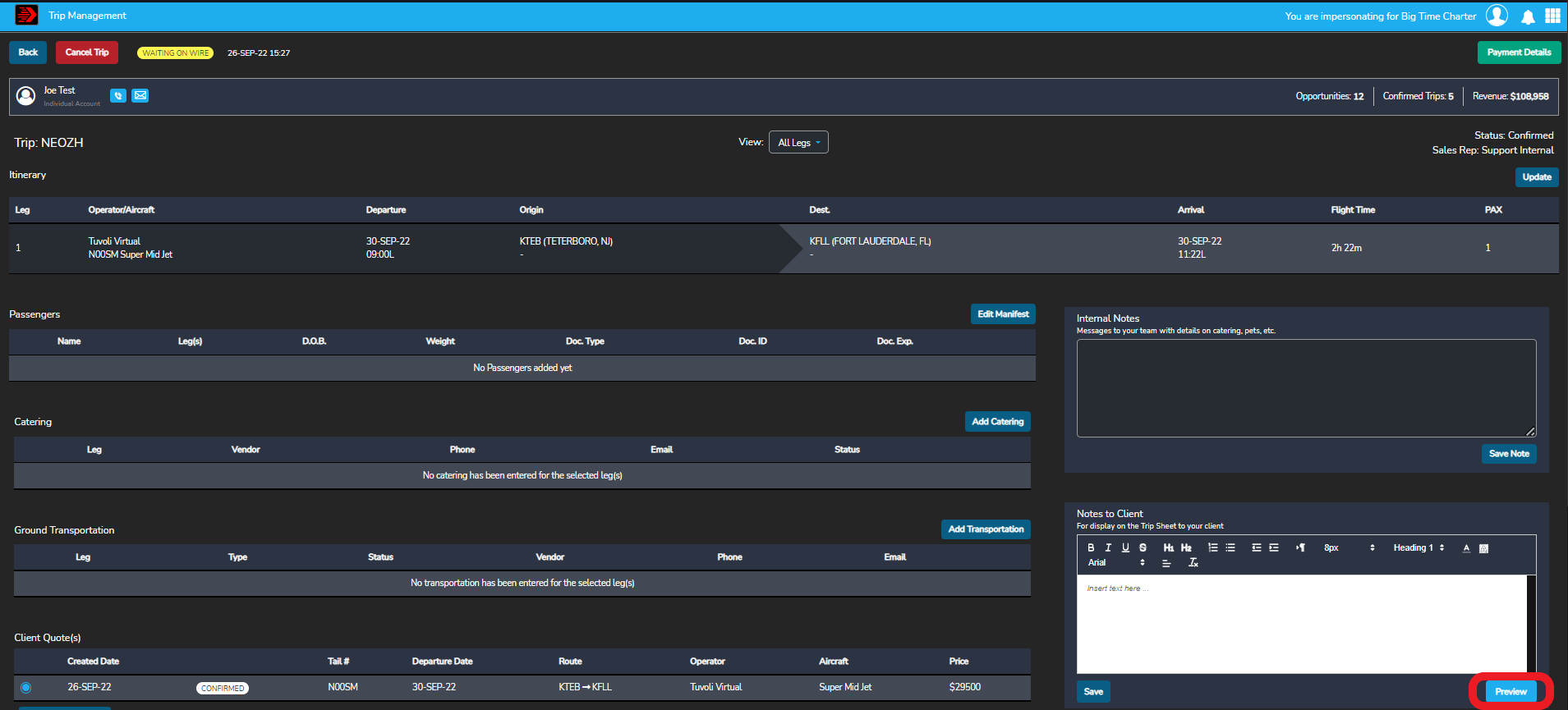 • Once you click on the desired trip, you will be navigated to the Trip Management page.  This is where you are be able to add/edit/remove information such as passenger details, catering, ground transportation, etc.  To navigate to the customizable Trip Sheet, simply click on the Create button located under the Notes to Client section on the right-hand side of the screen.