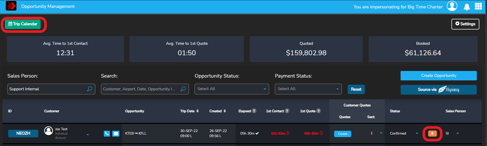 • To access the Trip Calendar, simply click on the Trip Calendar button located in the upper left-hand corner of your Opportunity Manager dashboard (screen shot below).  If you would like to bypass the Trip Calendar and go directly to the Trip Management page, simply click on the icon of the white arrow in the orange box located towards the end of the trip record.
