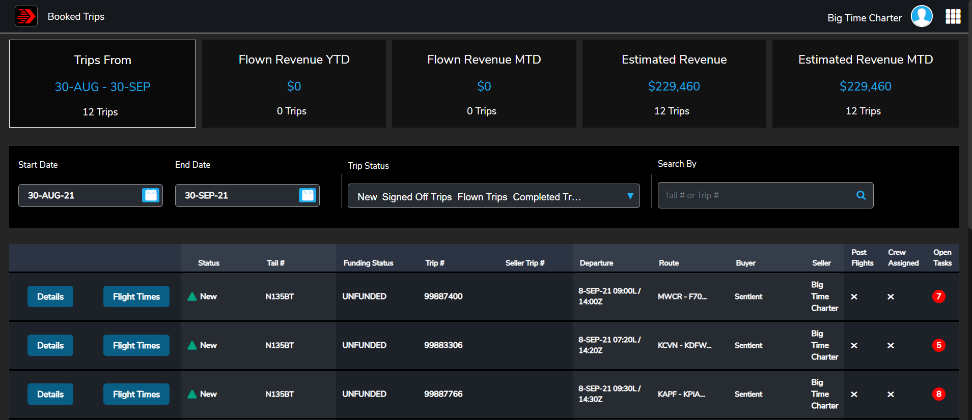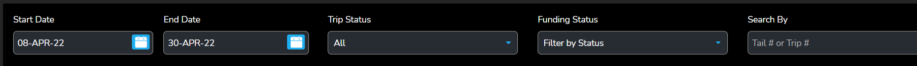 2. Recent trips will appear on-screen. You may also adjust the Start Date and End Date fields to expand your search. Additionally, you may search By Trip Status, Tail or Trip number.