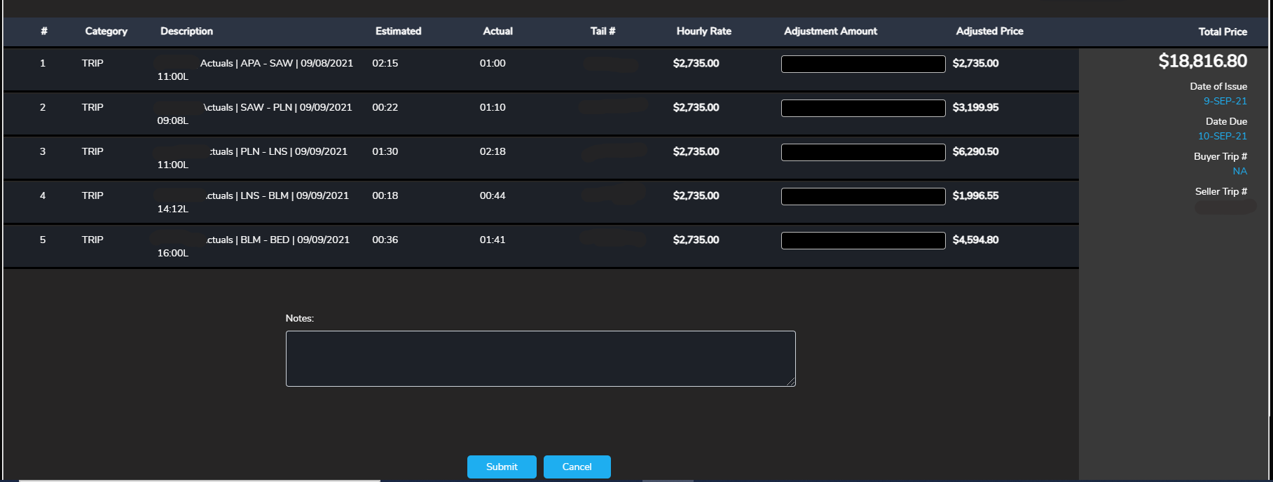 8. When the trip invoice displays, if adjustments need to be made to the trip amount (either positive or negative), enter the amount in the appropriate field in the Adjustment Amount column. Please note that comments need be entered in the Notes field at the bottom of the screen for any adjustments made to the invoice. When finished, click the "Submit" button at the bottom of the window. The trip invoice will automatically be submitted to FXAir for payment.
