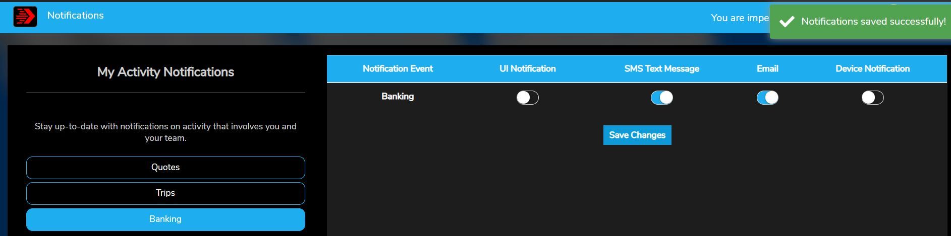 7. Click the ''Save Changes'' button. A pop-up message will confirm ''Notifications saved successfully!''