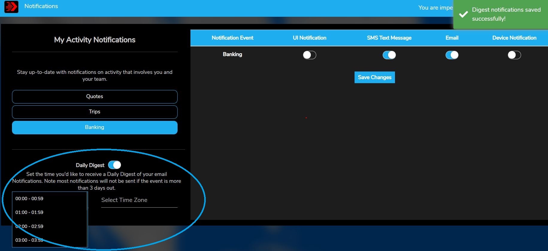 8. You may also choose to have a ''Daily Digest'' of your email notifications pushed to you at a pre-determined time. Select the desired time and appropriate Time Zone. Click the ''Save Changes'' button.