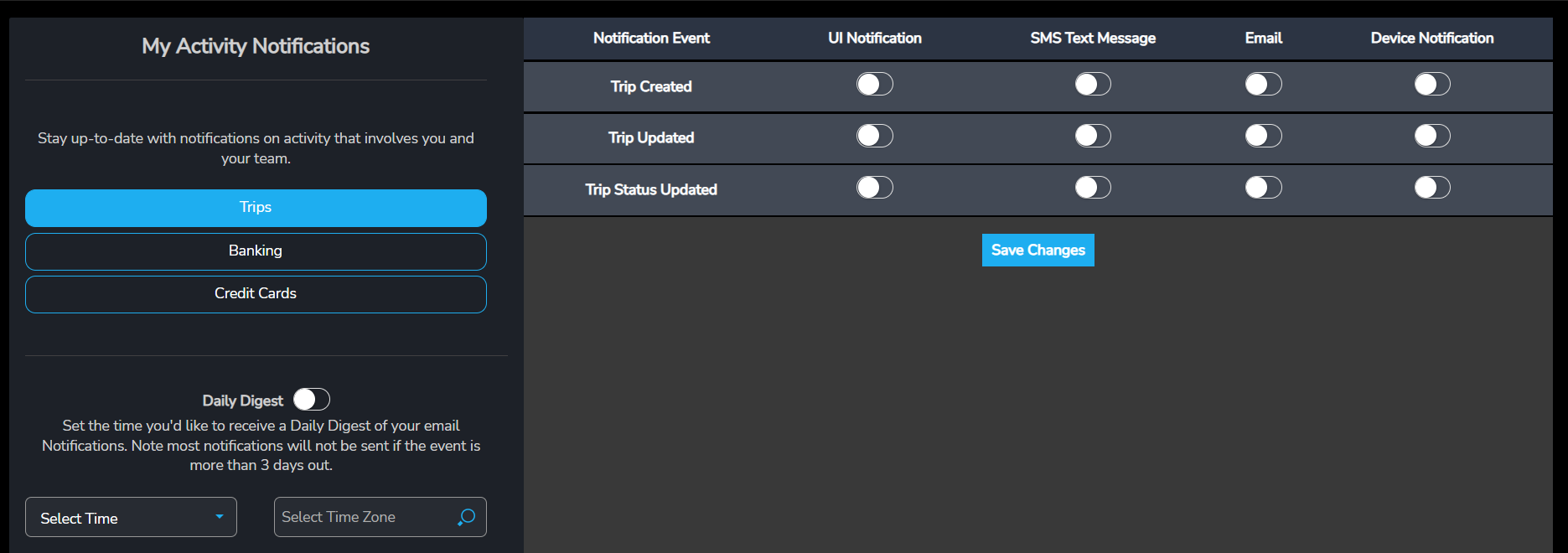 3. Select which Trip Activity Notifications (Trip Created, Trip Updated and/or Trip Status Updated) you would like notifications for and how you would like to be notified (UI Notification (within the Tuvoli app), SMS Text Message, Email and/or Device Notification (push notification)).