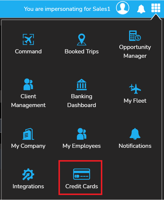 - Go back to the waffle menu (top right hand corner) and select "credit cards"