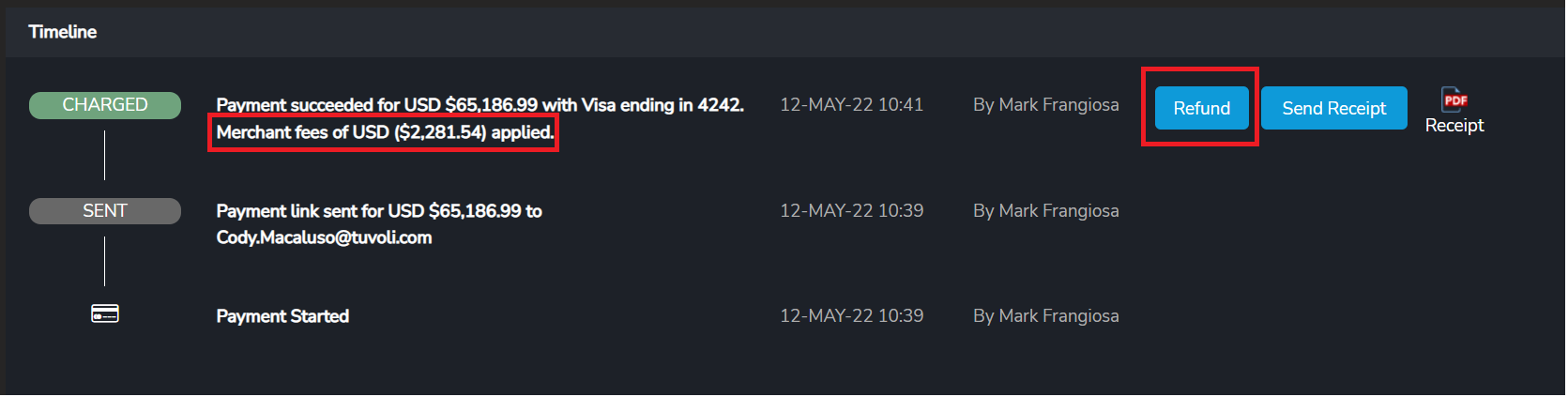 - Click "refund", note you will not be reimbured for the merchant fees previously charged.