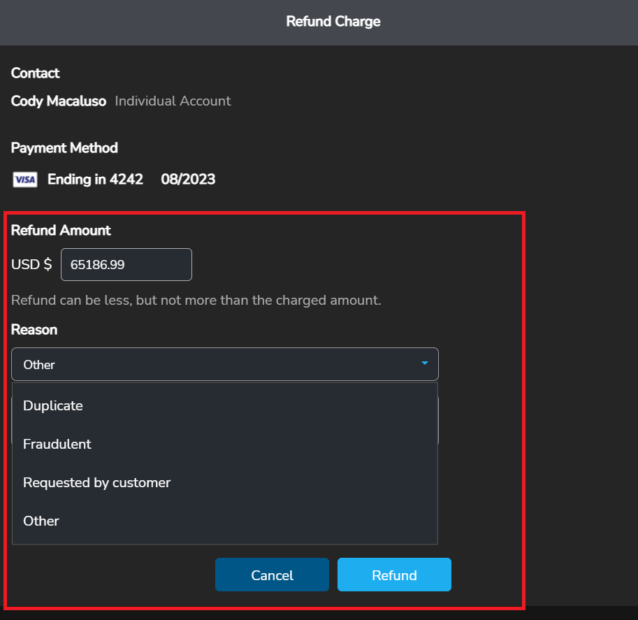 - The full amount will be pre populated but can be adjusted, select the reason, click "refund"