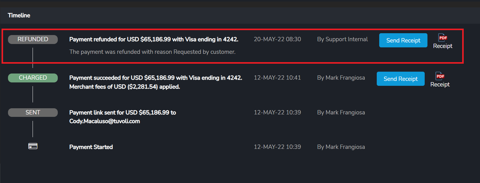 - The transaction will show "refunded", click "view" to view the refunded transaction, send a copy receipt of the refund or download a PDF.