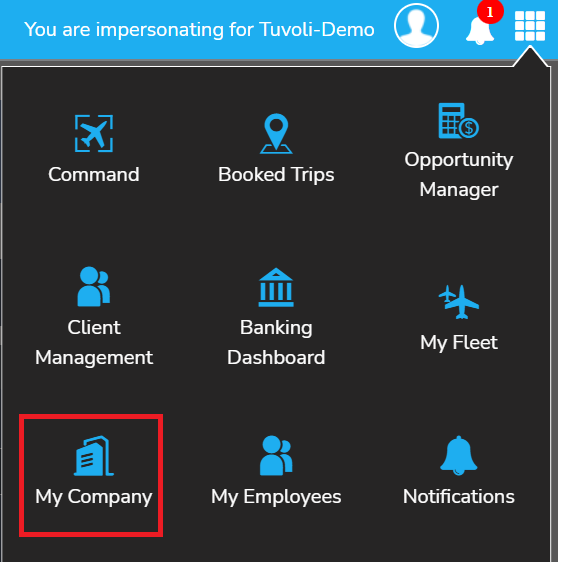 - To access the "My Company" page, click on the waffle menu in the top right-hand corner of your Tuvoli account. This will bring you to where you can make changes.
