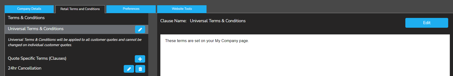 Under the "retail terms and conditions" page (2nd tab), to add (+), edit or delete terms and conditions.