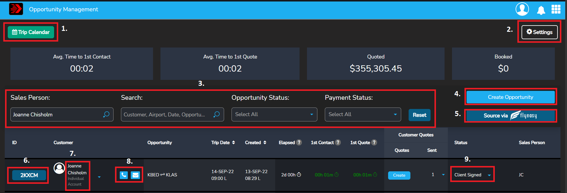 - Search for an opportunity by sales person, customer name, airport, date, opportunity id or payment status