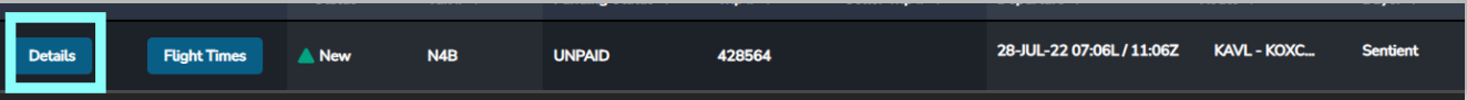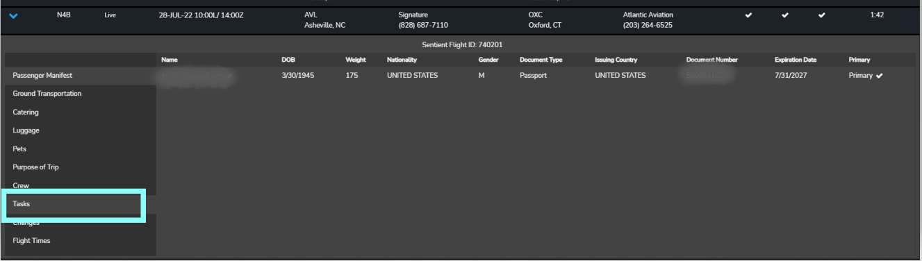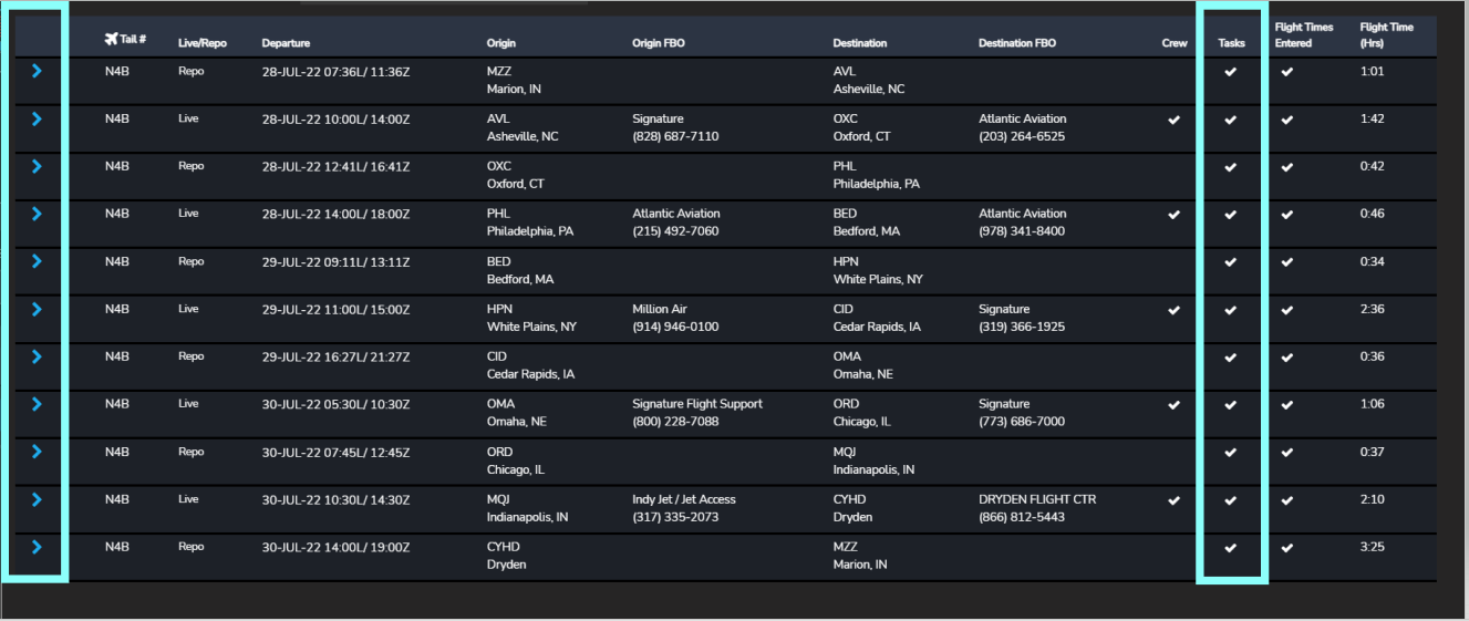 4- This will open the trip details. To view the details of each leg, click the blue carrot to the left of the tail#. To the far right, is where tasks are located. Click on the carrot to expand the leg and view full trip details including tasks.