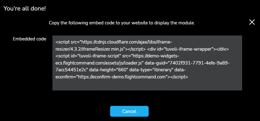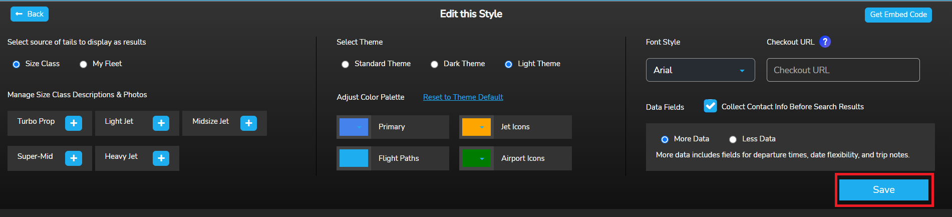 - Once you are satisfied with the changes, click "get embedded code" to obtain your company specific web widget code to be placed on your website. Please note, any changes made to the web widget will change the embedded code. Each time a change is made, you would need to click and copy the updated "embedded code" to be replace the old code on your website. This code should be pasted onto your website by whoever manages it.